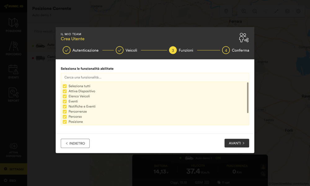 Come per i veicoli, è possibile attivare per un utente solamente alcune funzionalità. La voce della lista "Seleziona tutti" ha la medesima logica che per i veicoli: se selezionata, all'utente verrà garantito accesso anche a tutte le nuove funzionalità.